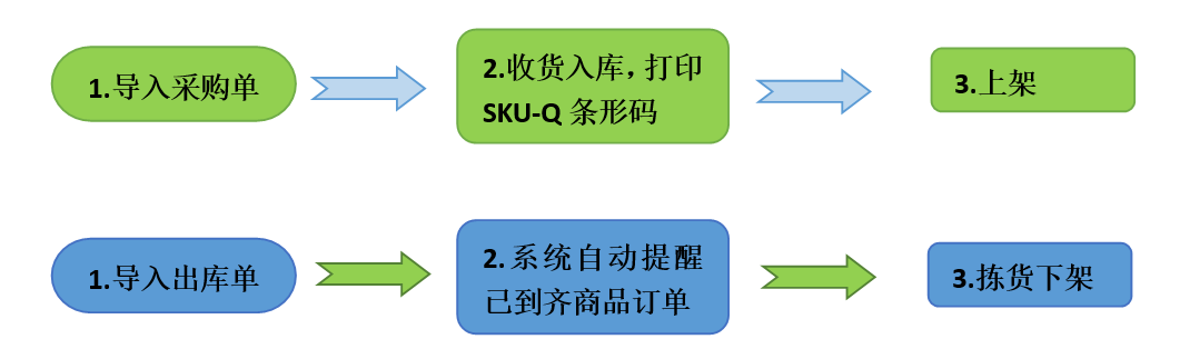 瑞康Ewms根据天鸟国际实际情况结合瑞康多年来在仓储管理系统方面的经验,优化天鸟现有操作流程、采用智能PDA设备实现更高效、更方便的拣货下架方案。瑞康首创将“SKU”条码升级到“SKU-Q”码,实现单件商品从进仓、上架、下架到出库整个周期内的溯源。更高效、更智能的管理每一件商品。Ewms出入库流程如下: