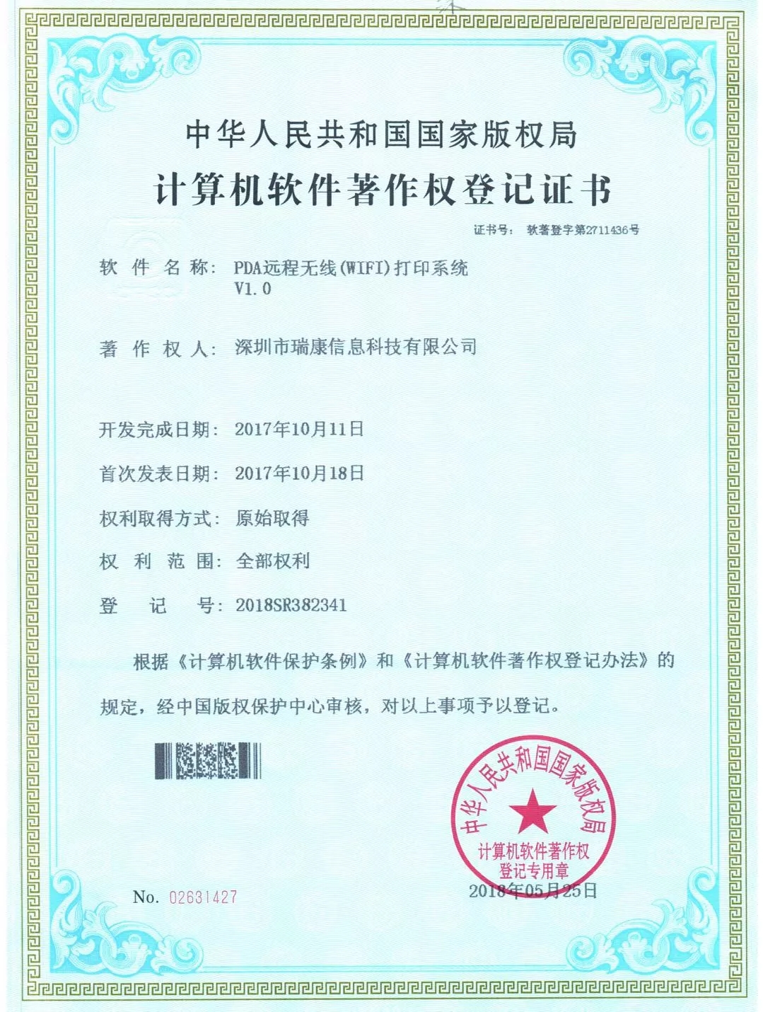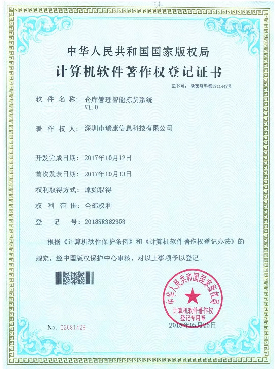 本次由我司独立研发的《仓库管理智能拣货系统V1.0》、《PDA远程无线(WIFI)打印系统V1.0》经中华人民共和国国家版权局考证,被认定为这两个软件的法定著作权人,从颁证之日起,其版权将得到“中国版权保护中心”的有效保护。