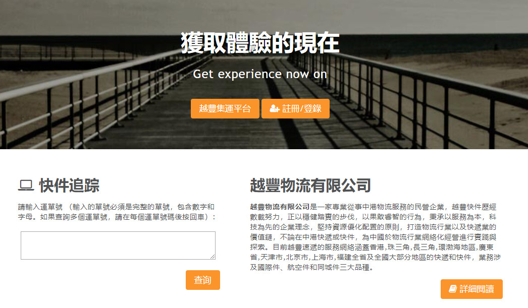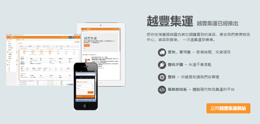 越丰物流有限公司是一家专业从事快递服务的民营企业,该公司以中港快递,香港本地件业务为主, 提供门对门服务, 收派车辆遍达全港各工/商业区, 每日安排多趟独立快件专车往来中港两地,并由专业人员办理报关清关手续, 使快件更快捷及稳妥地送达收件人。拥有强大的物流队伍,服务盖中港,包括香港,珠三角,长三角,环渤海地区, 广东省,天津市,北京市,上海市,福建全省及全国大部分地区的快递和快件。