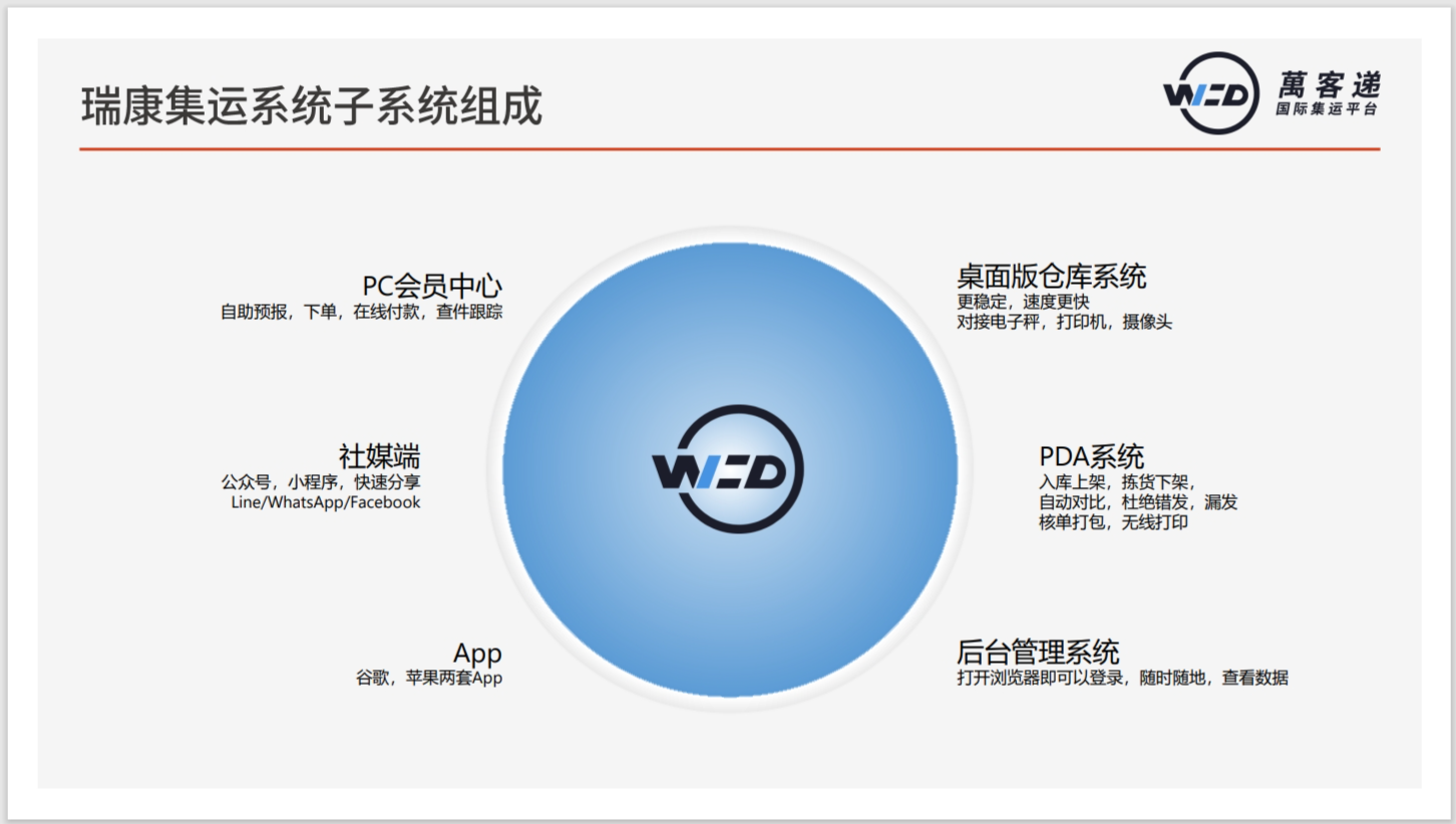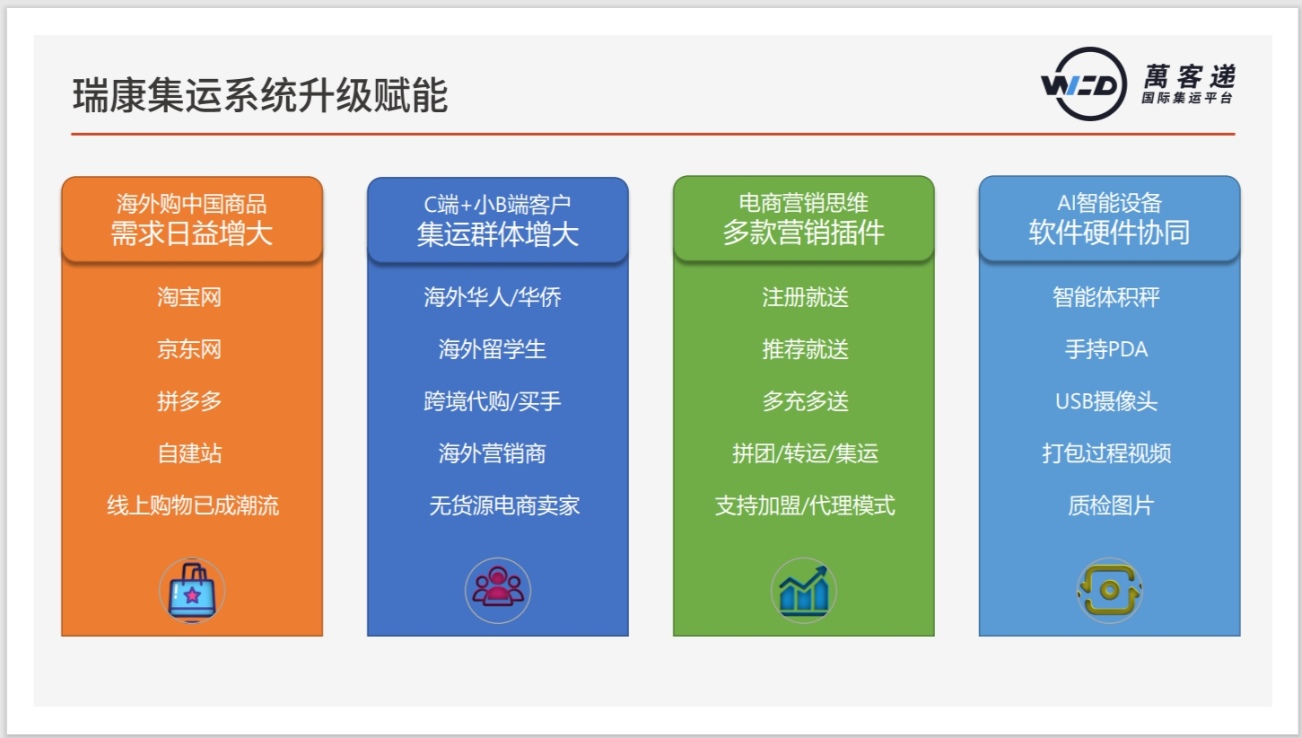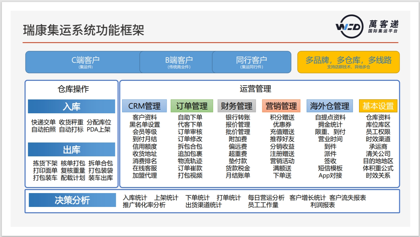 瑞康集运系统是专门为跨境集运服务商设计研发的集订单管理、会员管理、财务管理、仓储管理为一体的信息化系统。